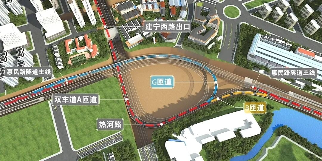 惠民大道综合改造工程全长约2.37公里,该工程将原高架桥改建为双向六车道隧道,隧道依次下穿中山北路、公共路、建宁西路、龙江路。