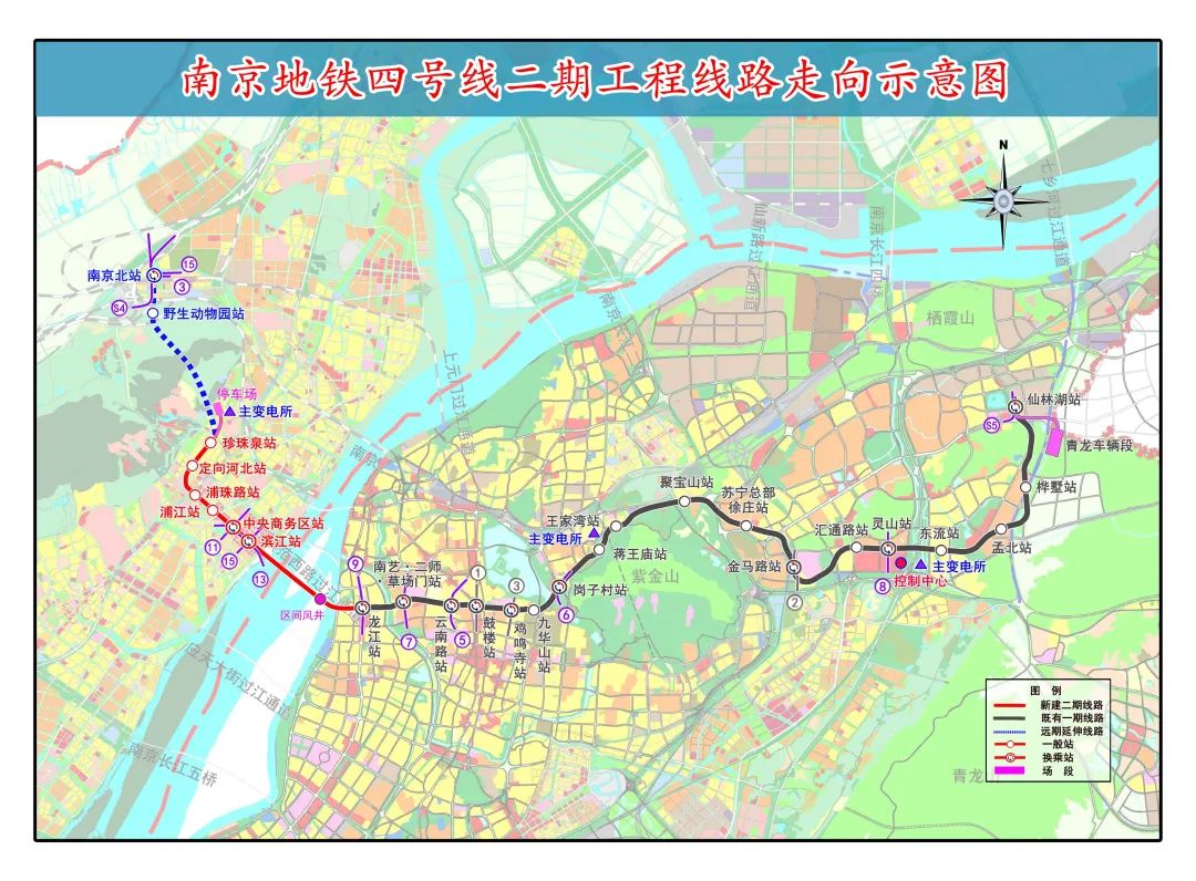 栖霞区和六合区,线路南起聚宝山站,栖霞山站后穿过长江后进入龙袍新城,于文峰路站向西进入六合新城,至雄州西路站折北至马鞍机场站,目前该条线路处于前期研究阶段。