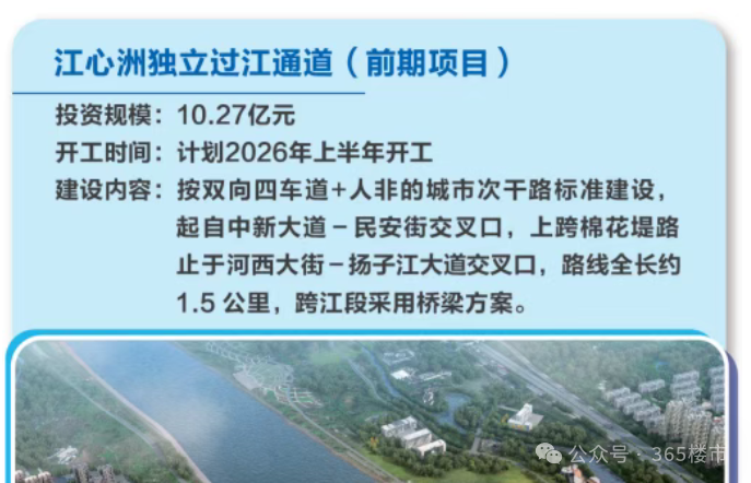 2、江心洲独立过江通道正处国家部委最后审批阶段,审批工作有望于明年一季度完成,项目力争2026年上半年开工建设。